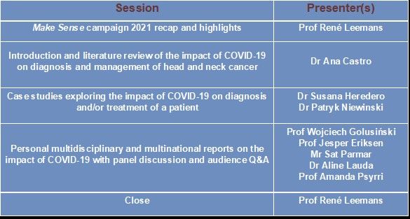 As an extension of the Make Sense campaign's 9th annual head and neck cancer awareness week (September 20-24), we are pleased to invite you to an upcoming webinar aimed toward any HCP involved in the management of head and neck cancer on the Impact of COVID-19 on the Treatment and Management of Head and Neck Cancer.